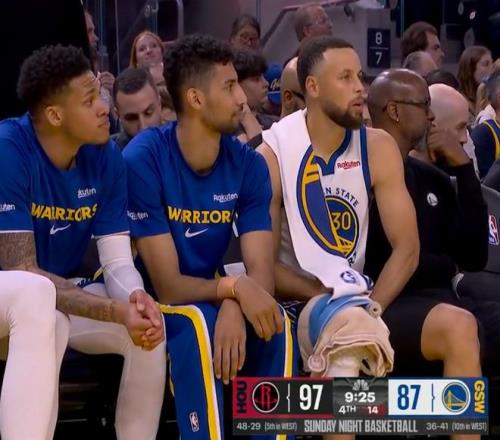 末节开场库里需要先休息,库里在场下一直在放松自己的右侧小腿与膝盖,还剩6分56秒库里回来。库里借追梦挡拆命中缩小到5分的三分球,库里抛投命中缩小到1分,申京关键2+1后,库里三分续命,杜兰特丢关键球科尔暂停,勇士手握绝杀机会,科尔还是为库里画了一个战术,只可惜库里三分绝杀不中。