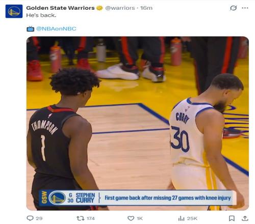 北京时间4月6日,勇士以116-117不敌火箭遭遇四连败。38岁的斯蒂芬-库里伤停27场后首次复出,科尔让他替补出战,这是库里生涯第七次替补,也是继2012年后首次替补出战,他的个人能力毫无问题全场26分钟就拿到29分+5个三分球,只可惜他丢了三分绝杀。