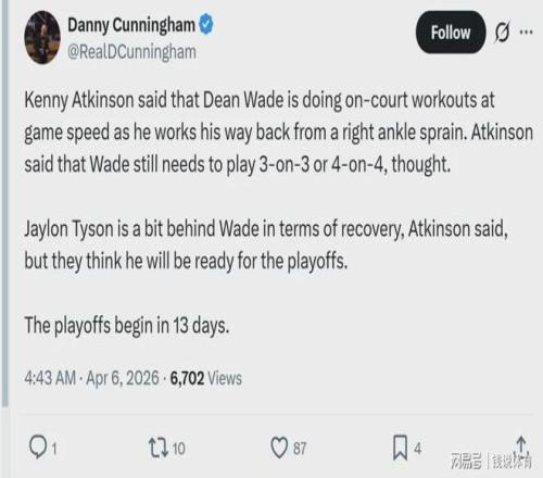 好消息是,两人的恢复均有新进展,右脚踝扭伤的韦德已经开始进行比赛强度的训练,接下来将逐步开展3对3、4对4的对抗训练;左大脚趾骨挫伤的泰森恢复进度稍慢,但主帅阿特金森透露,球队预计他能够赶在季后赛开始前复出。