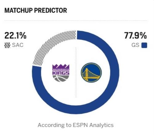 ESPN预测本场比赛胜率:勇士77.9%,国王22.1%。