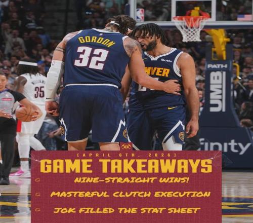 北京时间4月7日,NBA常规赛,掘金加时137-132力克开拓者,掘金豪取9连胜。此役过后,掘金51胜28负升至西部第三,湖人5...