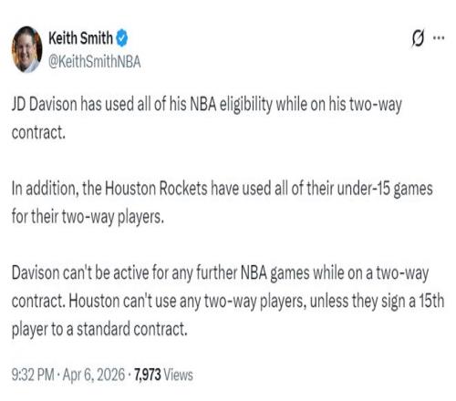 北京时间4月6日晚,根据NBA记者肯尼-史密斯的报道,JD-戴维森已经执行完了他双向合同50场NBA常规赛的额度,火箭在激活的50场中只让他打了27场,换言之戴维森已经无法为火箭出战任何的比赛,除非他们重新签下一名标准合同球员。