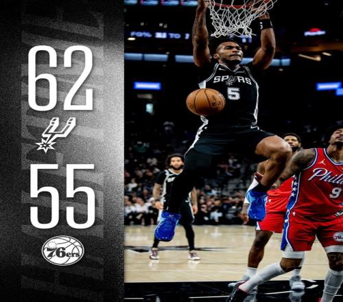 马刺队的卡斯尔得到三双19分、11个篮板和13次助攻,文班亚马得到17分和5个篮板,他因伤提前退场。哈珀得到17分和4次助攻,约翰逊得到13分和9个篮板,福克斯得到13分和4次助攻,科内特得到10分。76人队的恩比德得到34分和12个篮板,乔治得到16分、5个篮板和4次助攻,马克西得到15分和8次助攻,埃奇库姆得到14分和7个篮板。