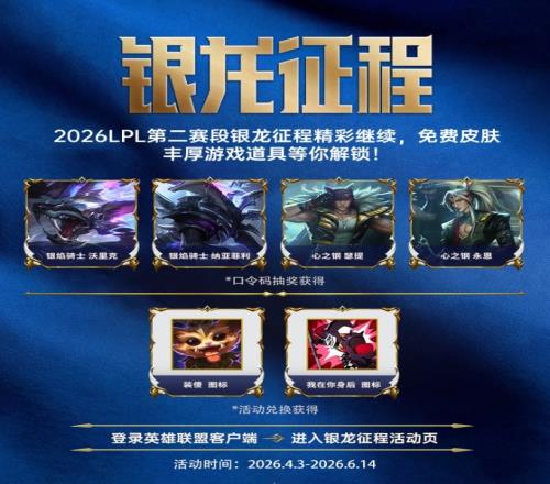 活动时间:即日起登陆英雄联盟客户端活动中心,进入“银龙征程”活动页面即可参与活动。烽烟起峡谷,壮志踏征途,2026LPL第二赛段,无畏竞巅峰!