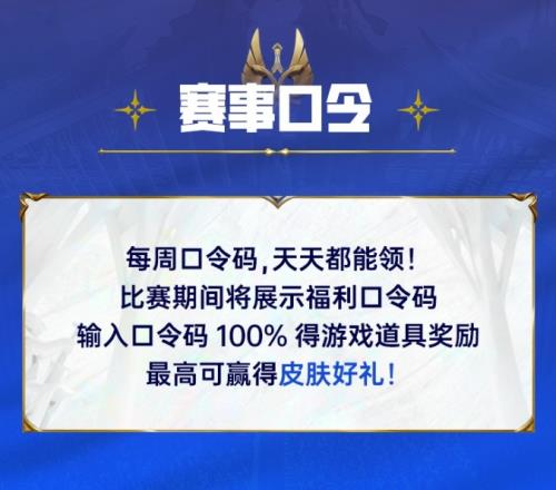 每周口令码,天天都能领!比赛期间将展示福利口令码,100%得游戏道具奖励,最高可得皮肤好礼;