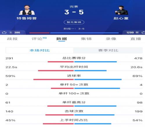 体育播报04月05日宣 斯诺克巡回锦标赛决赛,赵心童vs特鲁姆普,第一阶段战罢,赵心童暂时5-3领先特鲁姆普。双方首阶段数据如下