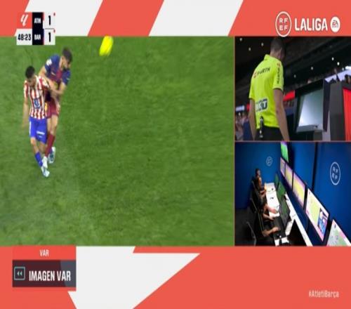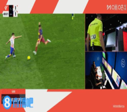 马竞vs巴萨一役:皮球明显处于双方争抢状态,主裁判最初红牌判罚正确,VAR本不应介入。VAR回看建议导致了错误改判,主裁判应坚持原判。