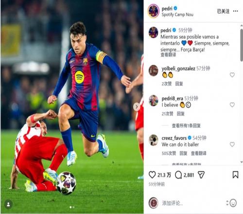 巴萨中场佩德里社媒晒出比赛照片,配文:“只要还有可能,我们就会努力尝试。永远、永远、永远,加油巴萨!”
