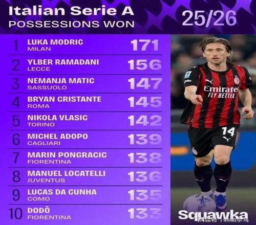 最让人五体投地的是在防守端,莫德里奇凭借171次夺回球权高居意甲首位,值得一提的是,紧随其后的拉马达尼比克罗地亚人足足小了11岁。