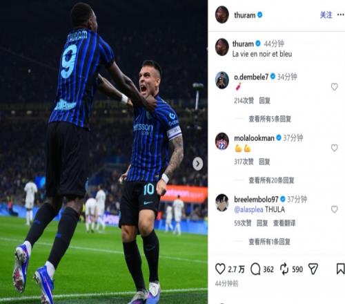 他也在赛后通过社媒晒出自己和劳塔罗的庆祝合照,并配文:“蓝黑人生。”
