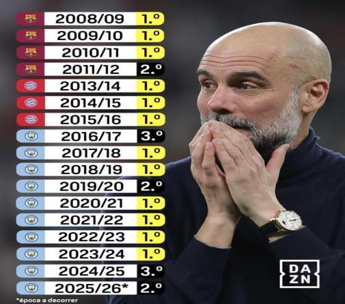 从执教巴萨开始,他基本每年都能把球队带到西甲第一;去拜仁三个赛季,全是德甲第一;到了曼城,又已经带走了6座英超冠军。这意味着瓜迪奥拉的强,是横跨了三个顶级联赛、长达十几年的高水准。