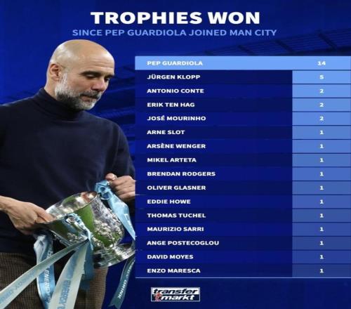 单看冠军数,瓜迪奥拉和同时代的英超名帅完全不在一个维度。克洛普带利物浦确实有过巅峰,也拿过含金量极高的联赛和欧冠,但在国内奖杯的累积上,还是被瓜迪奥拉远远甩在身后。