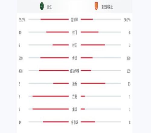 本场数据方面,重庆铜梁龙与浙江队的射门次数比为8-10、控球率比为30%-70%、角球数比为1-9。数据上全面占优的浙江队依然输球,也印证了这是一场十足的爆冷。